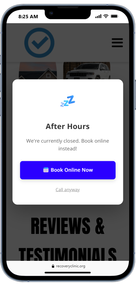 Visitors don't know your hours. They call, get no answer, and move on to the first competitor that responds. Catch them while you can by sending them to your booking system.