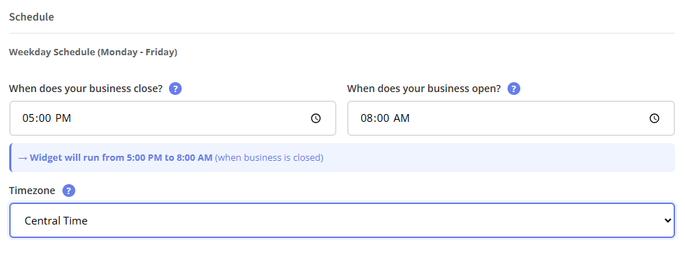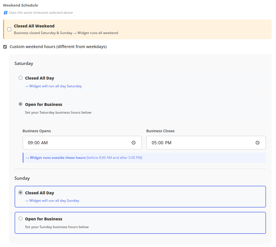 Set your hours once in your timezone. The widget handles all the timezone math automatically—visitors in any timezone see the after-hours message only when your business is actually closed.