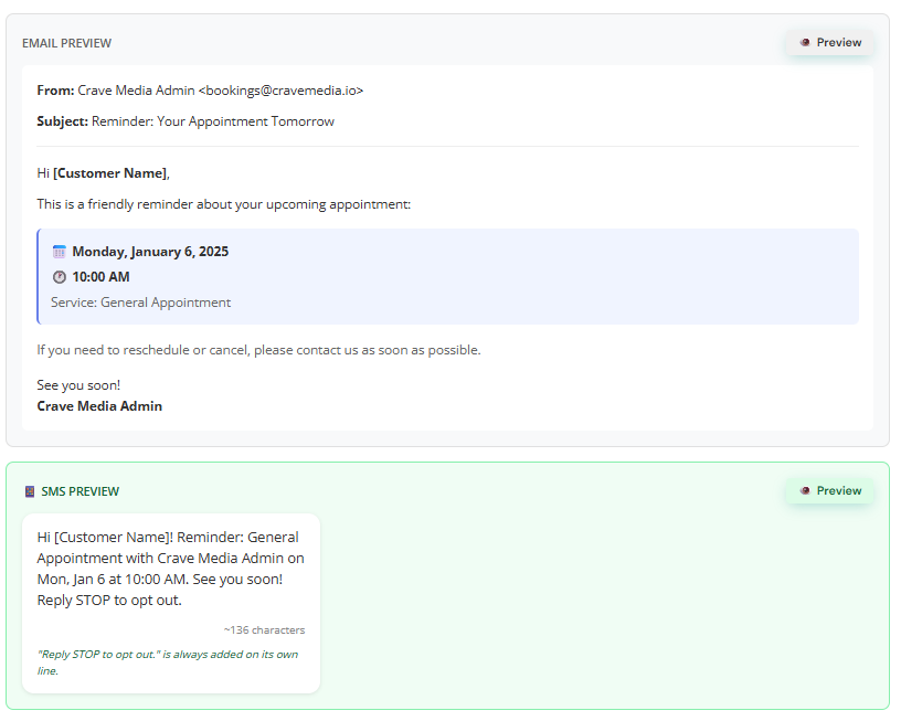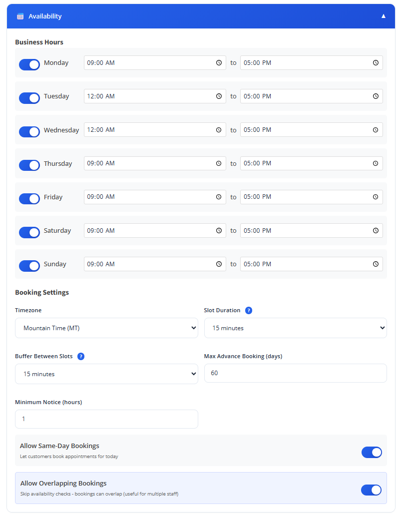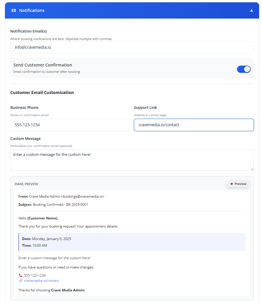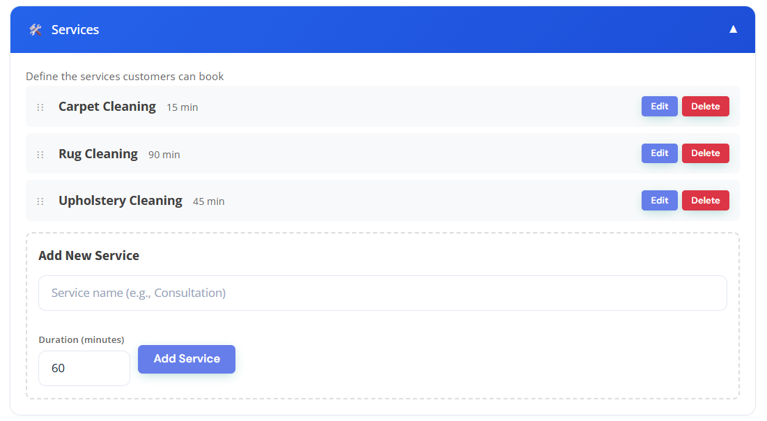 Add your services with custom names and durations. Set your availability, time slots, and booking rules. Preview everything in real-time.