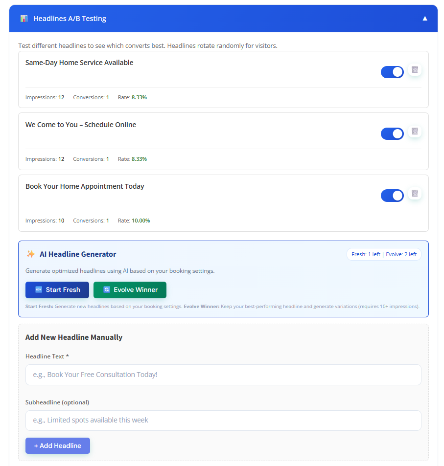 Match your brand with custom colors, headlines, and button text. AI can generate headline variations to test what converts best.